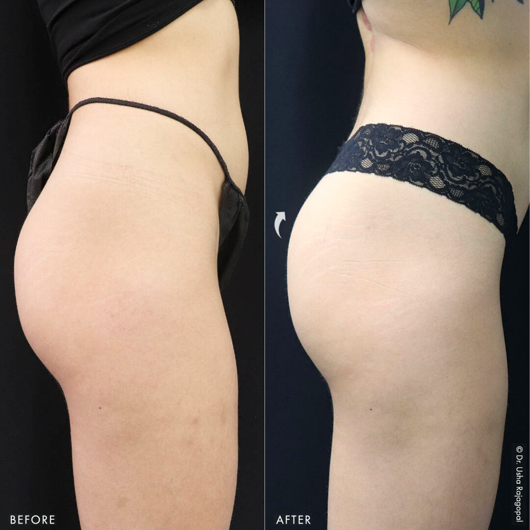 Are you looking for a non-surgical option to enhance your butt or even out your hip dips? Our office offers the Radiesse Butt Lift, which is a non-surgical alternative to the traditional surgical Brazilian Butt Lift (BBL). Radiesse is made of calcium hydroxyapatite. This dermal filler initially stimulates the production of Type 3 collagen as well as elastin, and later stimulates the production of Type 1 collagen, which is most commonly found in our skin and tendons. Most individuals will require three treatments spaced 2-3 months apart for optimal results. Read our blog to learn more about non-surgical butt augmentation.
